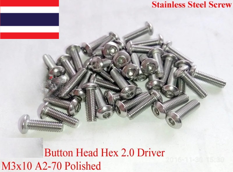 เรามีสกรู M3x2.5 M3x4 M3x5 M3x6 M3x8 M3x10 M3x12 M3x14 M3x16 M3x18 M3x20 M3x22 M3x25 M3x30 M3x35 M3x40 M3x45 M3x45 M3x50 ในสต็อก หัวปุ่ม Hex 2.0 ไดรเวอร์ SUS 304,A2-70, ขัดเงา ROHS แรงบิด 1.2 Nm. ภาพวาดคือ M3x10